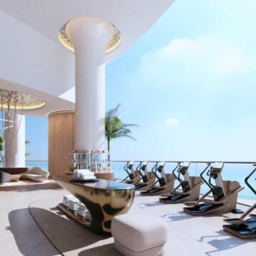 Over 20,000 sq.ft of amenities span three oceanfront levels, curated and furnished by Bentley Home. The property welcomes residents through a three-story lobby with 33-foot-high windows, framing panoramic ocean views.