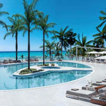 Spaces for leisure and wellness include a restaurant and lobby bar, whiskey and cigar lounges, a 14-seat movie theater, and a game room with golf and racing simulators. Outdoor experiences feature a landscaped pool deck, oceanfront cabanas, and exclusive beach services with attendants and dining.